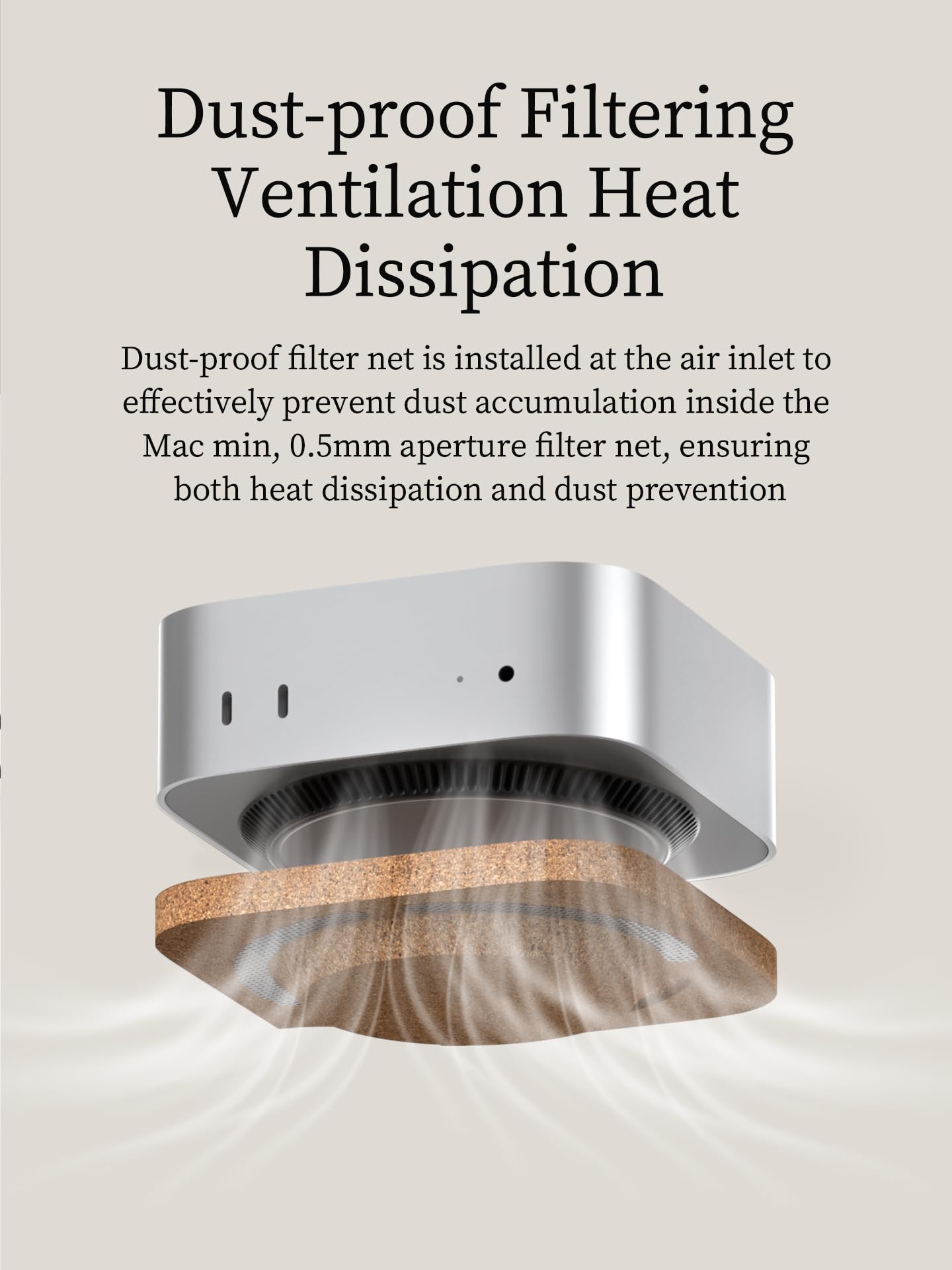 - Dust Proof & Heat Dissipation: The rear vent is equipped with a dust-proof filter net, which ensures both bottom ventilation and heat dissipation. The air inlet is equipped with a 0.8mm aperture dust filter to effectively prevent dust accumulation inside the Mac mini
